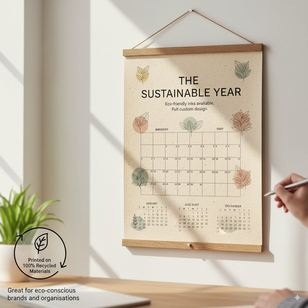 Same great calendar format – printed on fully recycled materials. A great way to keep your brand visible all year round while keeping your environmental impact low.